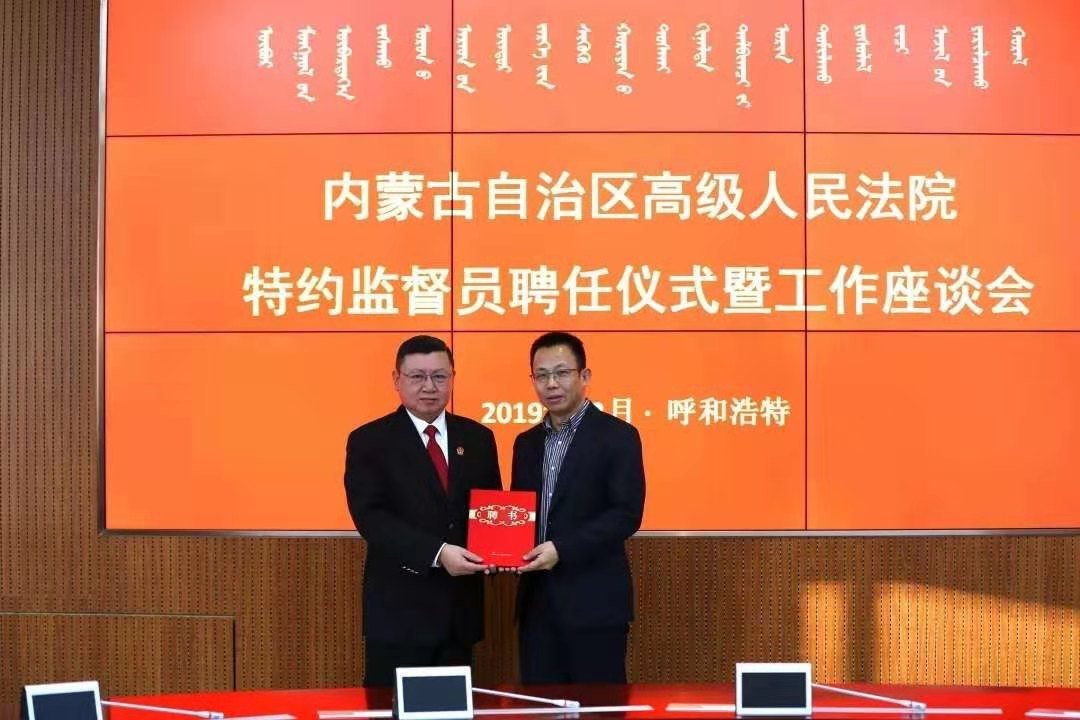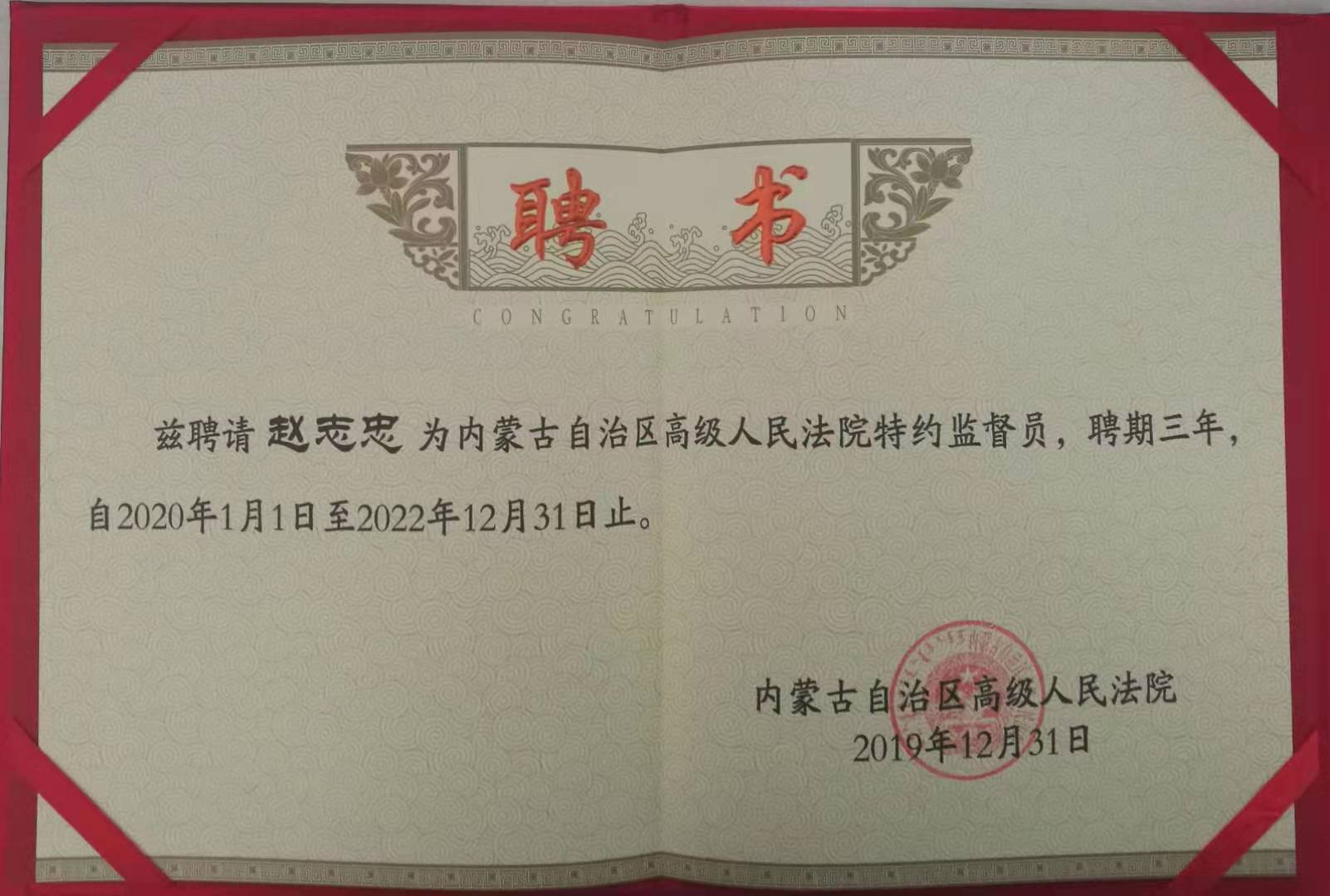 我所主任赵志忠律师被内蒙古自治区高级人民法院聘为“内蒙古自治区高级人民法院特约监督员” 2019年12月31日,内蒙古高院举行首届特约监督员聘任仪式暨工作座谈会。我所主任赵志忠律师被内蒙古自治区高级人民法院聘为“内蒙古自治区高级人民法院特约监督员”,并由内蒙古高院党组书记、院长杨宗仁颁发聘书。 为进一步加大审判工作接受社会监督的针对性、有效性和及时性,充分听取各界意见、积极回应社会关切、主动接受群众监督,不断增强审判机关的司法公信力,内蒙古高院积极建立健全特约监督员制度,聘任来自各级人大代表,政协委员,各民主党派、工商联、无党派人士、专家学者、新闻媒体及基层群众20人为第一届特约监督员,首次聘期3年,自2020年1月1日至2022年12月31日止。